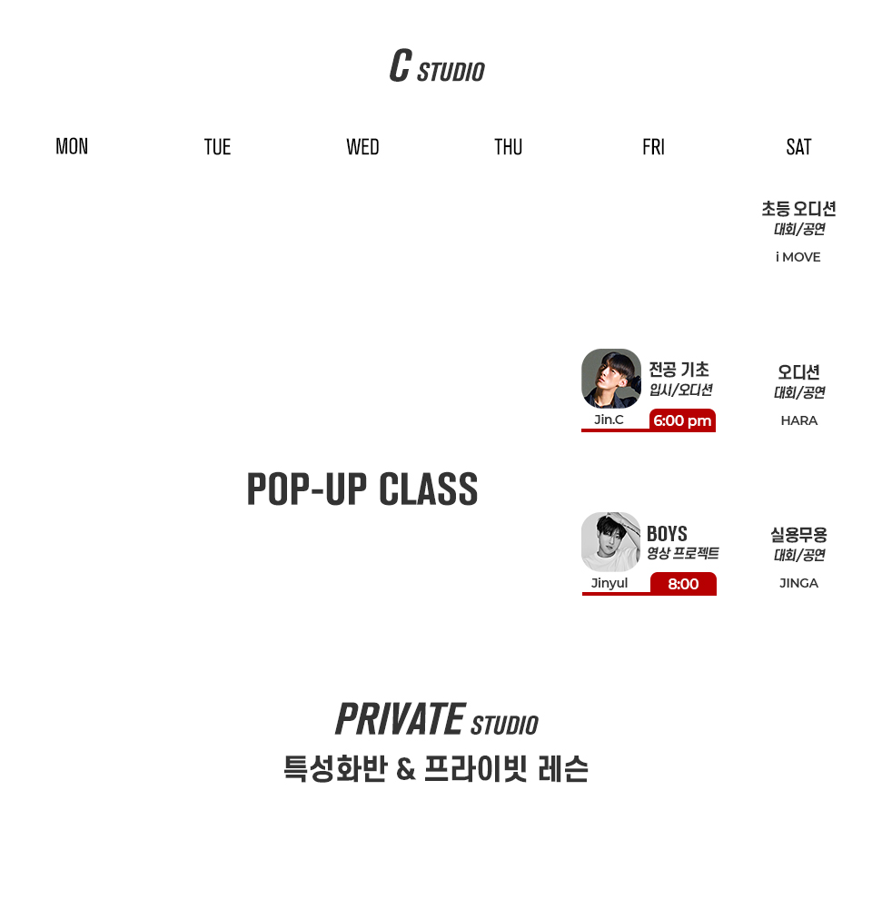- 실용무용 입시 (주 3회) 월/수 6:30-8:30 pm, 금 8:00-10:00 pm